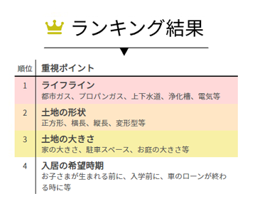 重視するポイントを選んでいくと、あなたの「土地選びの重視ポイント」ランキングが判明します。