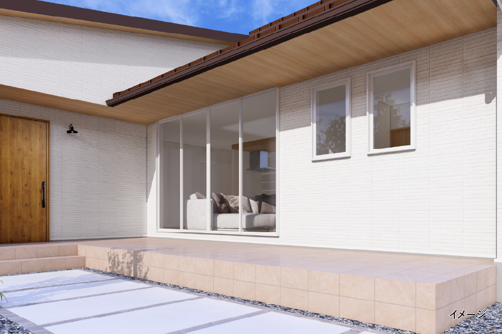 屋内と屋外が自然に繋がる幅7mのタイルデッキ。アウトドアリビングとしても楽しめて家族のここちよい時間が過ごせます -