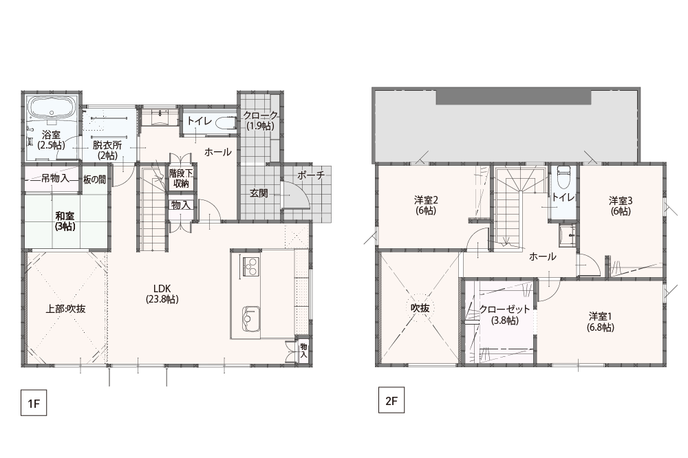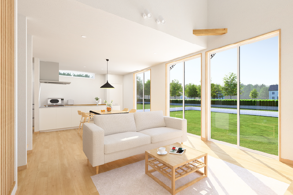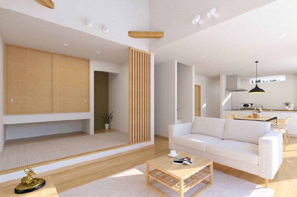 23.8帖の広々としたLDKに、上へと視線が抜ける大きな吹き抜け。 家の中心に配置した階段は、帰宅した家族が必ずリビングを通る設計で、日々の何気ない会話を自然に育みます。 また、2つの回遊動線が家の中の「渋滞」をなくし、朝の準備から夜の家事まで、流れるような心地よさを生み出しました。 リビングや小上がりの和室など、家族がそれぞれお気に入りの場所で過ごしながらも、どこかでお互いを感じられる――。そんな自由でゆるやかな繋がりが、この家にはあります。 圧倒的な開放感と、計算し尽くされた機能美が共演する住まいを、ぜひご体感ください。
