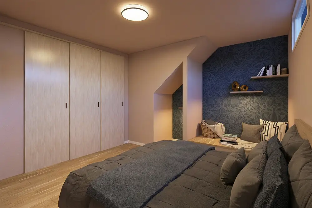 健康器具を設置して体を整えたり、来客時には宿泊スペースとしても活用できる小屋裏収納。暮らしに合わせて柔軟に使える、ゆとりのある空間です。