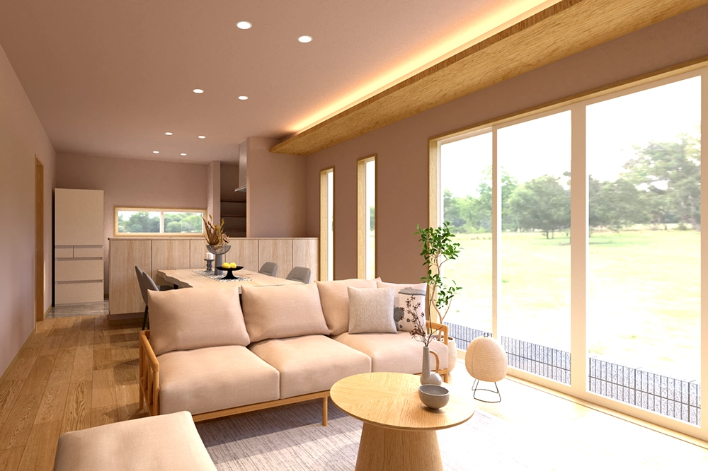 27坪というコンパクトなサイズの中に、回遊できる家事動線、室内干しまで完結する洗濯動線、そして折り下げ天井と間接照明が彩る上質なLDKを。「これから」の暮らしに本当に必要なものを、無理なく、無駄なく整えた平屋です。大きすぎない安心感と、これから先もずっと快適に暮らせる設計を、ぜひ実際にご体感ください。