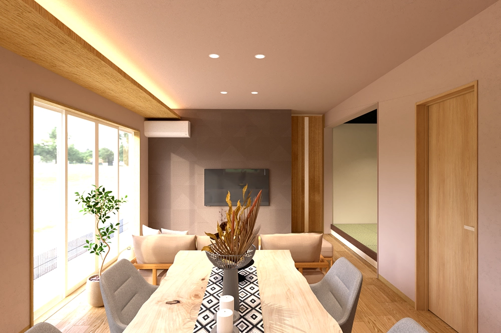18.3帖のLDKは、折り下げ天井と間接照明が夜にやわらかな陰影を生み、落ち着きある空間に。TV背面には幾何学模様のブラウンクロスをあしらい、コンパクトながらも上質さを感じられる仕上がりです。