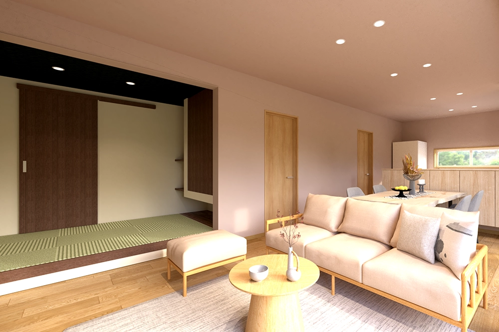 小上がりの和室は、あえてLDKと雰囲気を変えた静かな“自分時間”の場所。和紙調クロスとウォルナット建具、落ち着いた天井色で包まれた空間は、心をほどくひとときを演出。天井高にも変化をつけ、自然と長居したくなる設えです。