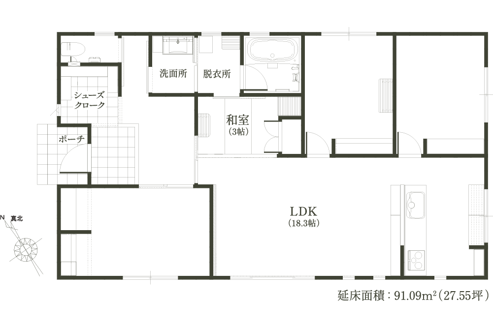 玄関ホール以外は廊下を設けず、27坪を最大限に活かした無駄のない3LDK。行き止まりのない回遊動線で家の中をスムーズに移動でき、コンパクトでも窮屈さを感じさせない設計です。