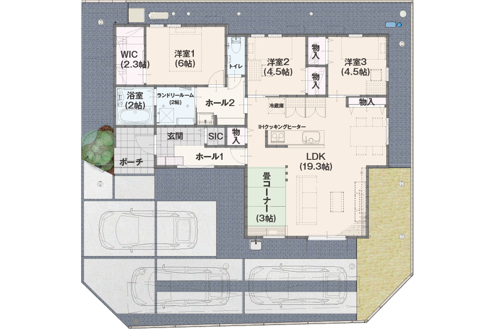 3方向が開けた開放的な角地に、リビングダイニングキッチン19帖超の平屋が誕生。