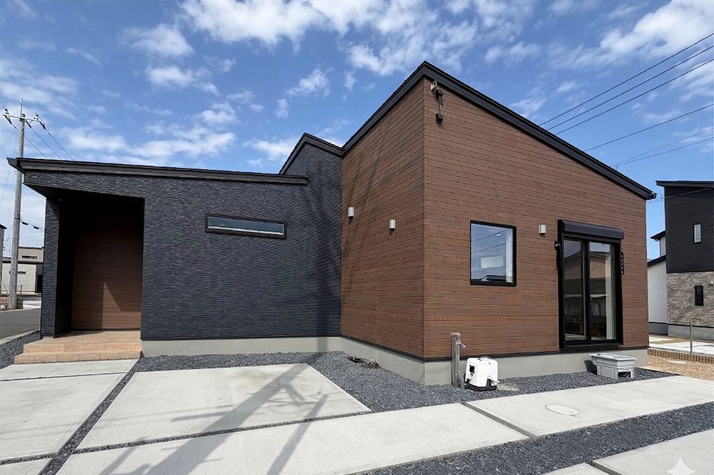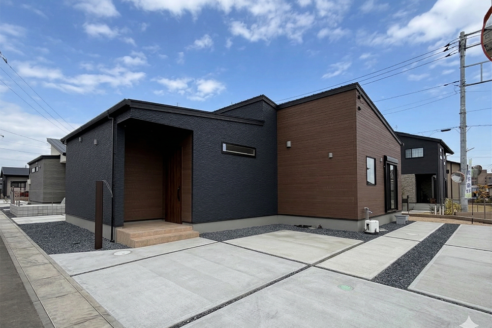 ネイビーを基調とした外壁に、木目調ブラウンをアクセントとして組み合わせた、落ち着きと上質感のある平屋住宅。重厚でありながら温かみも感じられる外観が、街並みに美しく調和します。