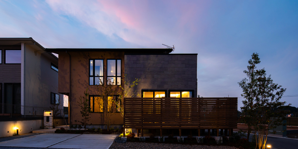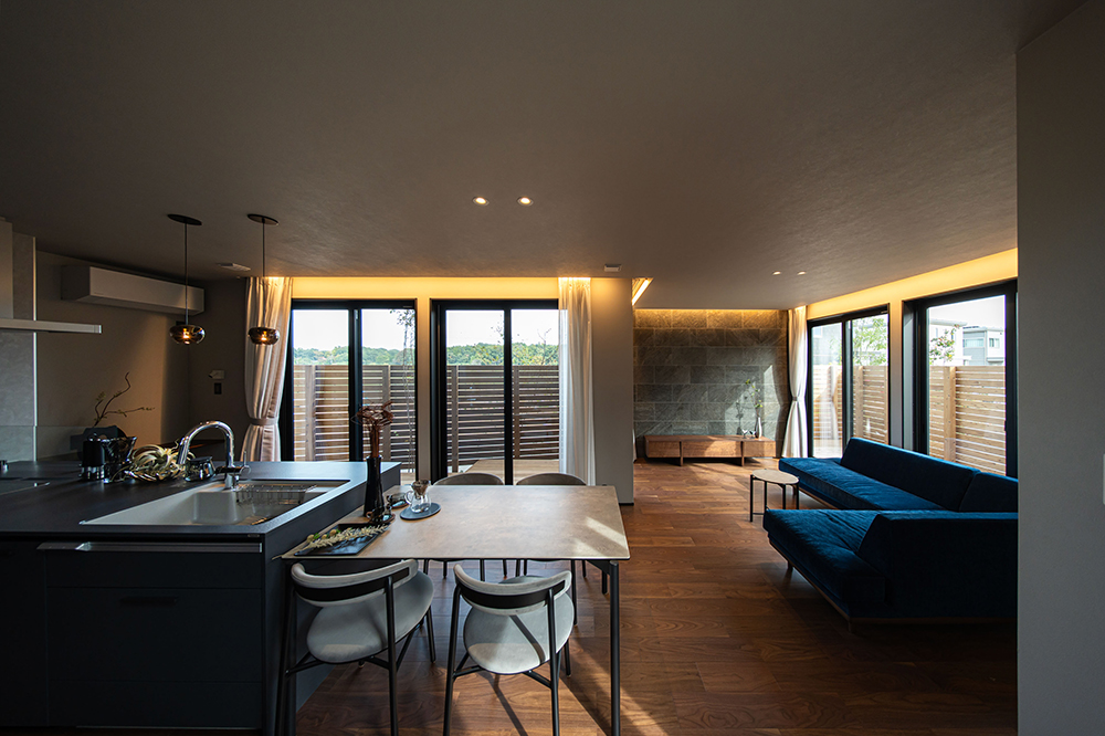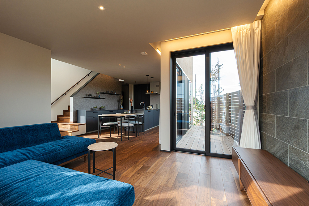 角地のポテンシャルを引き出す設計により、室内は外の空気感と緩やかにつながります。ソファに身を委ねれば、視線はウッドデッキの先へ。