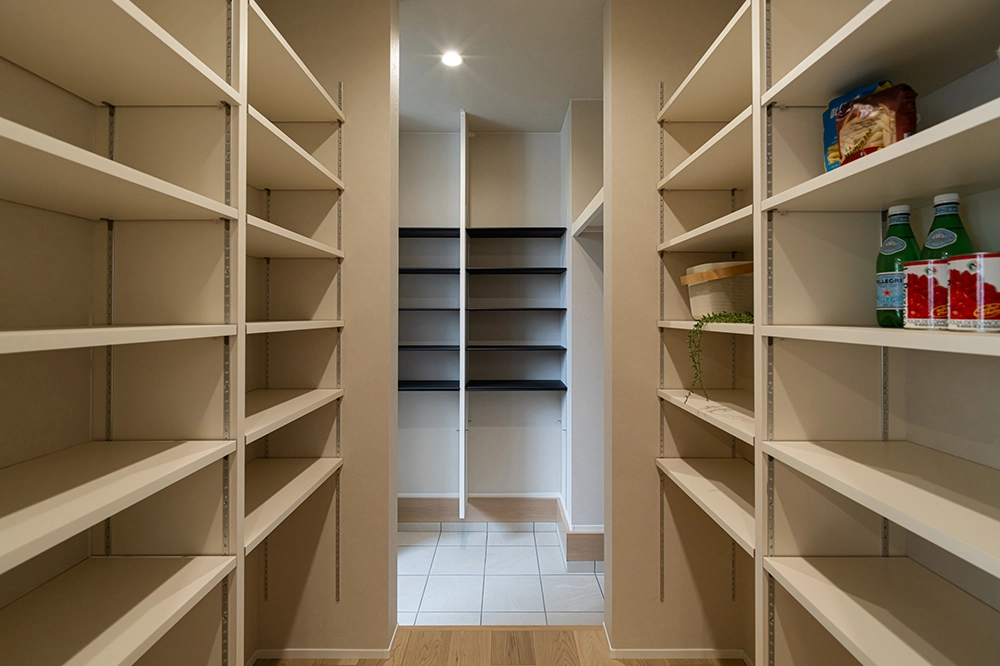 玄関からLDKへと繋がる動線と、クロークを通ってパントリーに繋がる動線がある2way玄関。