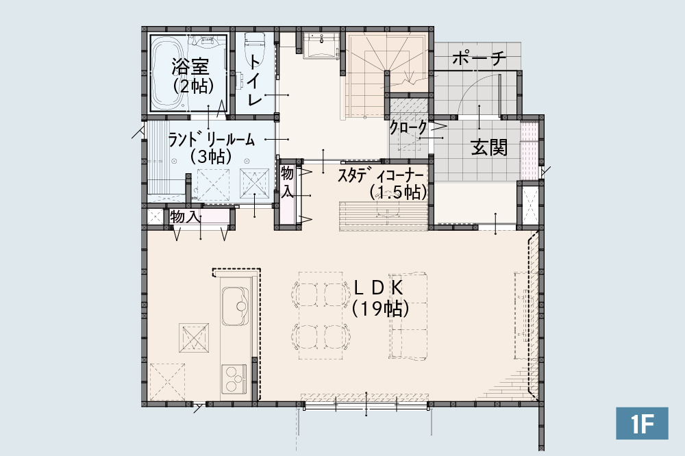 来客時にはそのままリビングへ、家族用には収納やシューズクロークを通る動線に分けられるため、キレイと使いやすさを両立できます。スタディーコーナー