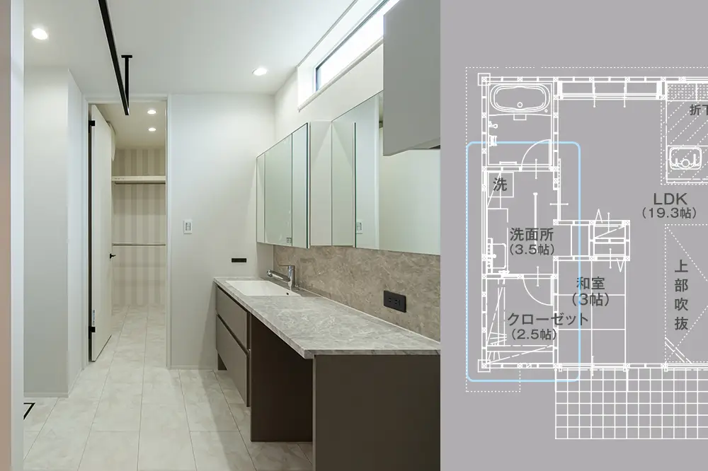 仕事も、子育ても、ちゃんと向き合いたい。だからこそ、家事に追われる時間は減らしたい。洗って、干して、しまうが一直線。買ってきたものがすぐ片付く回遊動線。暮らしを整える収納設計。忙しい毎日を変えるのは、努力ではなく、間取りの工夫。