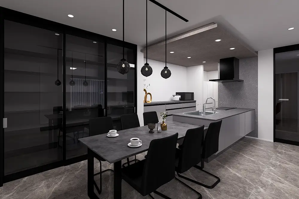黒やグレーを基調にした、落ち着きのあるモダンな空間。ダイニングには大容量の収納を設け、食器やカトラリーはもちろん、リビングまわりの細かな物もすっきり収まります。空間の美しさを保ちながら、日々の使いやすさにもこだわりました。