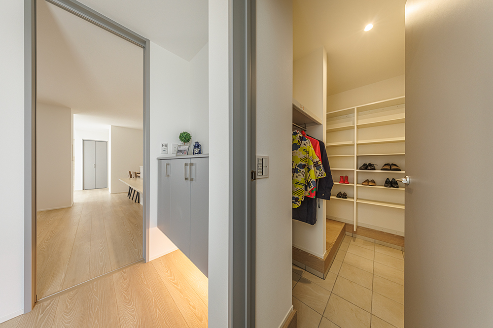 帰宅後は玄関からクロークへ直行し、荷物やコートを片付けてそのままリビングへ。日々の暮らしを快適にする便利な動線が整っています。暮らしに寄り添った設計だから、自然と片づけもラクに。