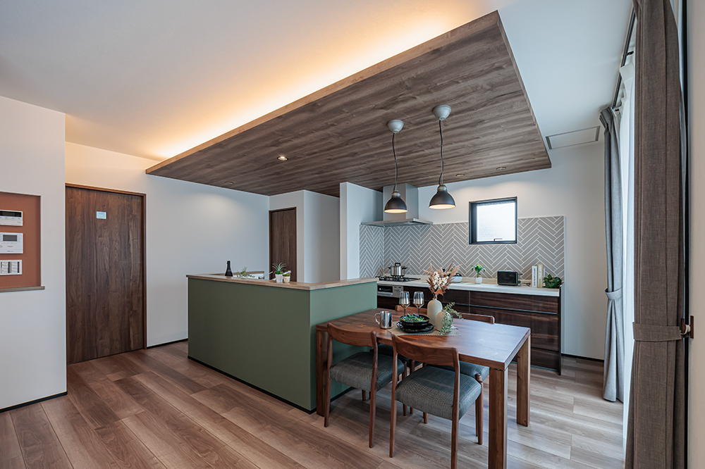 家族と並んで料理を楽しみ、そのままダイニングで食事を囲めるアイランドキッチン。折下げ天井と間接照明が特別な時間をより心地よく彩ります。