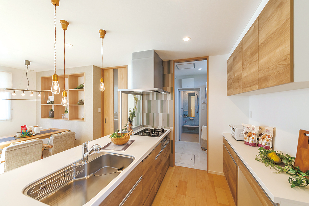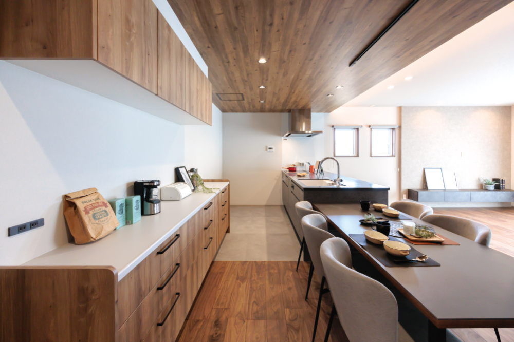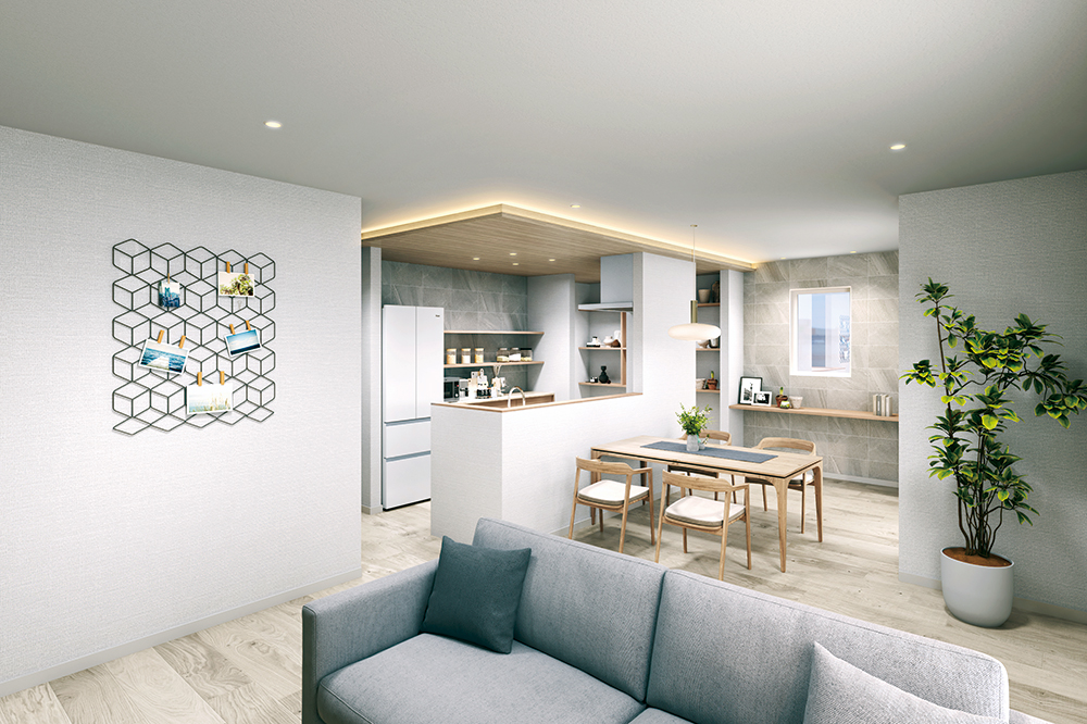 調理と食事がすぐつながる配置で、家事も効率的に。毎日の家事が軽くなり、気持ちにもゆとりが生まれます。2人でキッチンに立つ時間も心地よく、自然とゆったりした暮らしのリズムが生まれます。 -