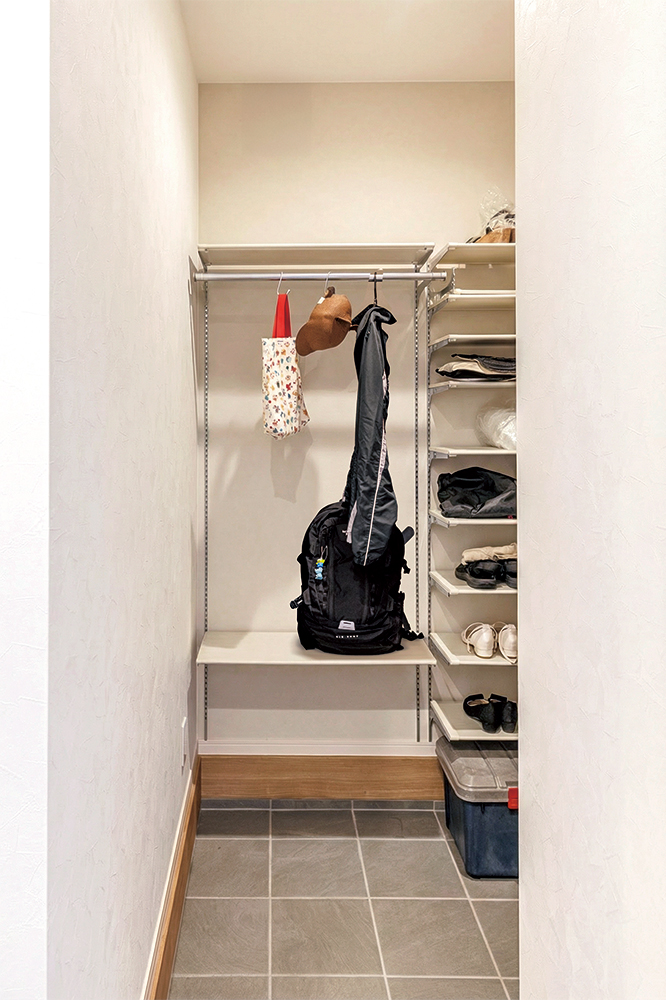 ベビーカーや外で使うおもちゃを土間収納にしまえるので、玄関まわりがすっきり。お出かけの準備もしやすく、家族みんなで気軽に外へ遊びに行けます。 -