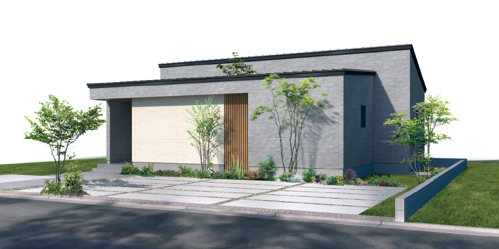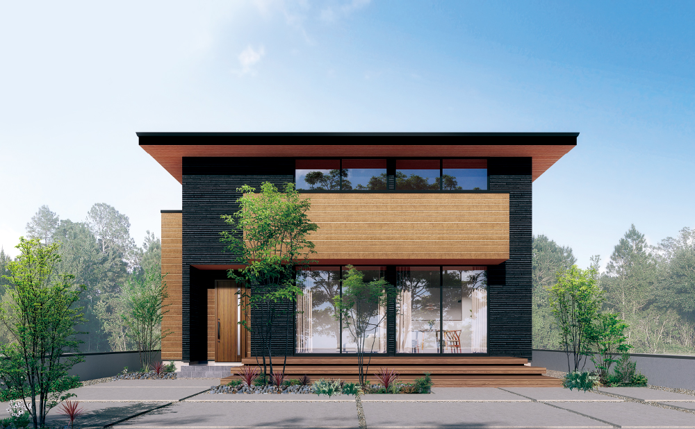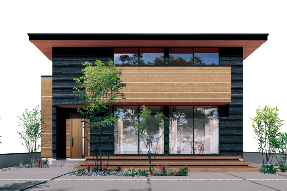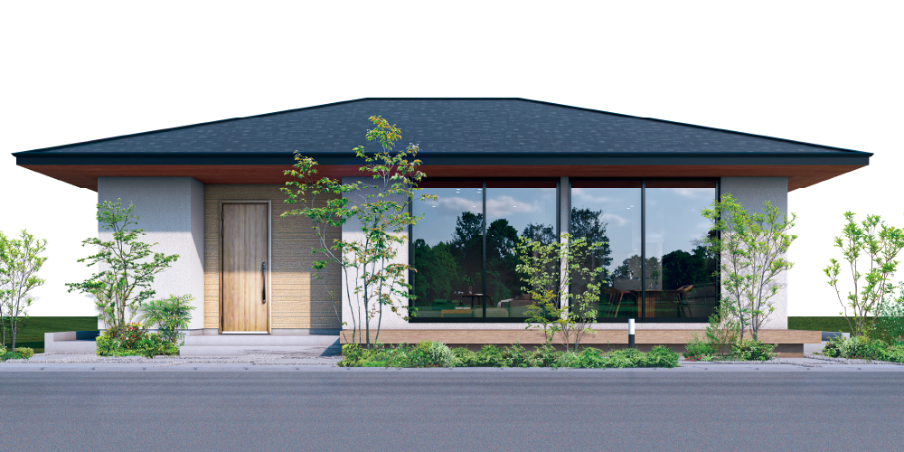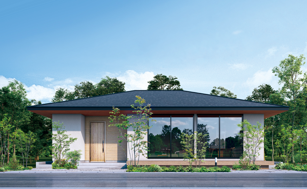 寄棟屋根の穏やかな水平ラインに、木目の軒天が温かみと上質さを添えるデザイン。直射日光をやわらかく遮る機能性を備えながら、さりげなくセンスを感じる仕上がりで、気分まで心地よく高まります。 -