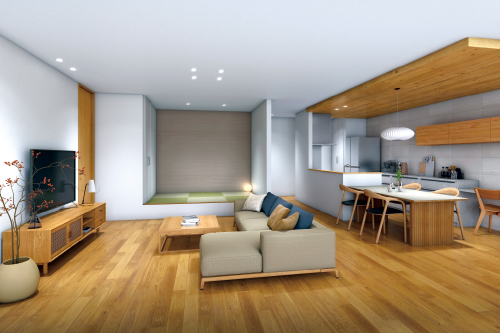 自然光が広がる開放的なリビングは、家族の会話や笑顔が集まる心地よい場所に。リビングを見渡せるオープンキッチンや、隣接するスタディスペースによって、家事をしながらでも子どもを見守れる安心の動線が整っています。 -