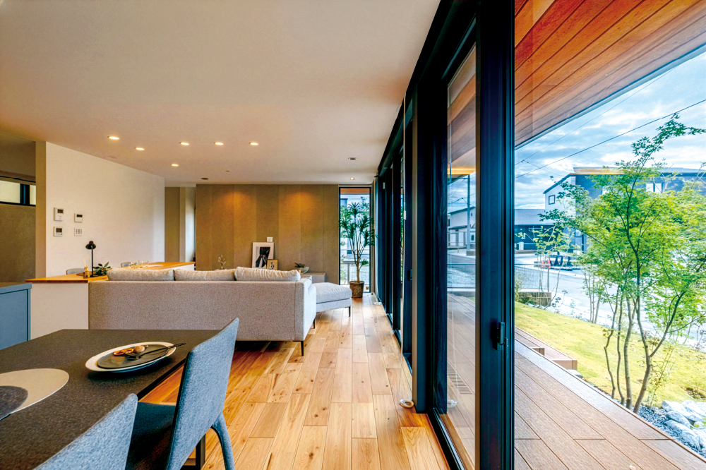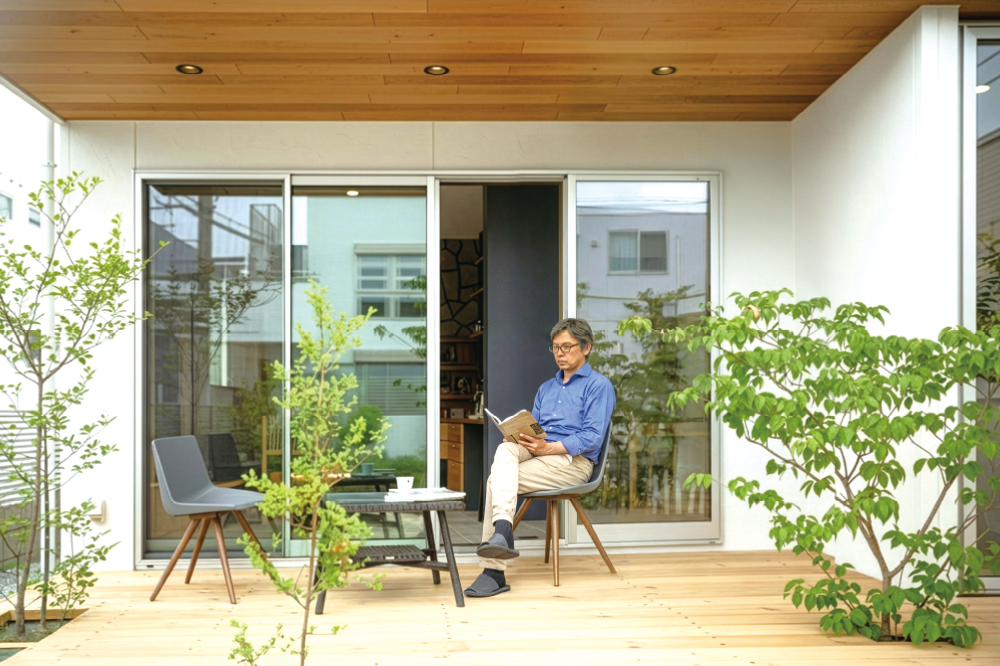 室内から庭へとゆるやかにつながる空間は、お互いの気配を感じながら、好きなことを楽しめる“ちょうどいい距離感”を作ります。室内で本を読みながら、庭では植物の手入れをしていたり、穏やかな時間が自然に流れます。 -