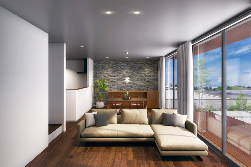 石目調の壁と無垢床が調和する、上質なLDK。大きな窓からテラスへと視線が抜け、柔らかな光が室内を満たします。素材の質感が日常を贅沢に彩る住まいです。 -
