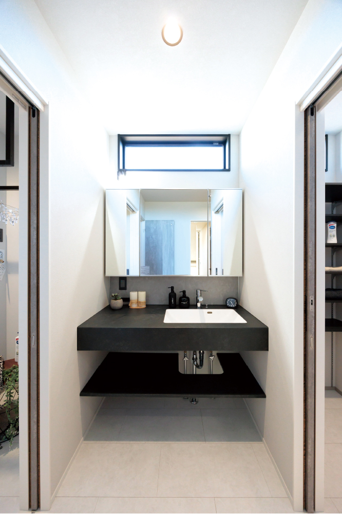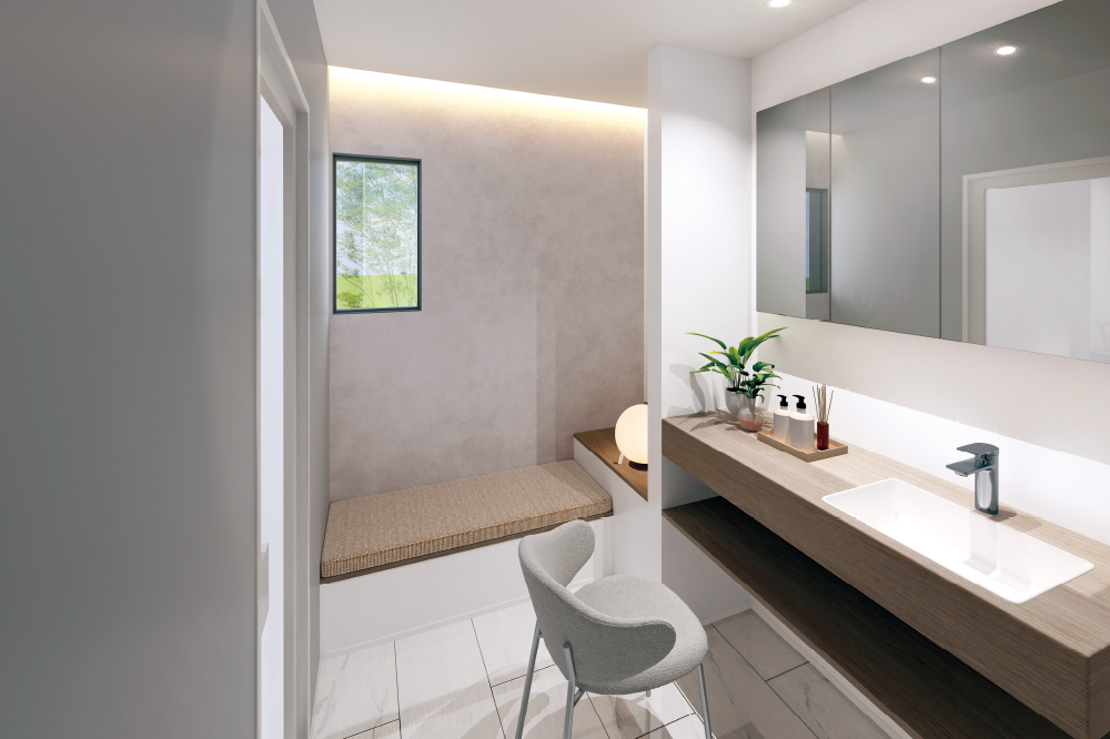 洗面を整えるための場所としてだけではなく、“気持ちを切り替えるラウンジ”としてデザイン。上質な素材感とゆとりあるレイアウトで、身支度の時間が心地よいリズムに変わります。毎日のルーティンが、美しく軽やかに整う空間です。 -