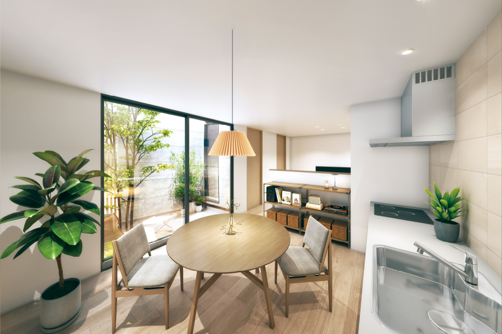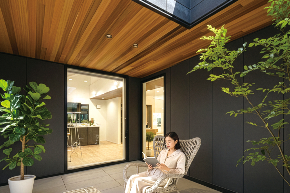 外の光と風を取り込みながら、住まいの中心に“余白”をつくる中庭。外の視線を気にせず、大好きな植物に囲まれてプライベート時間を過ごせます。 -