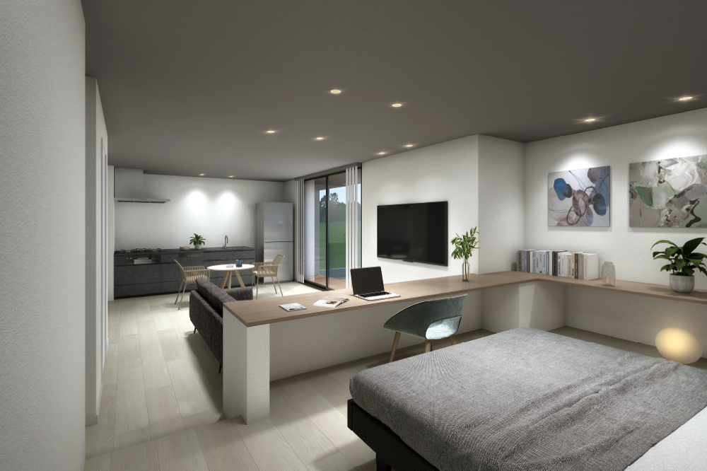 生活動線を限りなく滑らかにつなぐ、扉のない“ノンストップ動線”設計。キッチンとダイニングがひと続きになり、作る・食べる・くつろぐがスムーズに完結。ひとり暮らしならではの合理性を最大限に引き出す、スマートな空間です。 -