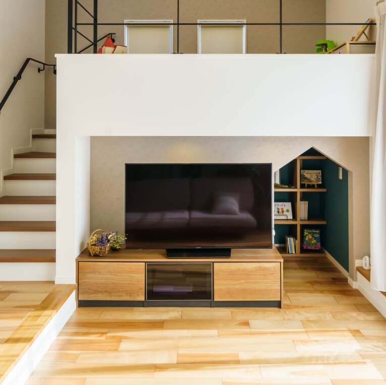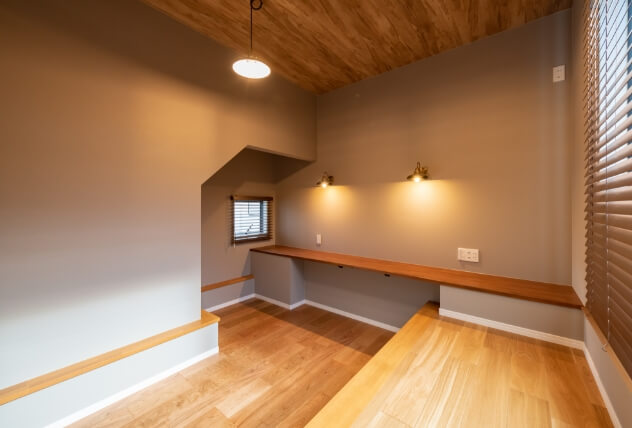 - 古河展示場を見て参考にしたダウンフロアです。書斎・猫たちと遊ぶスペースとして丁度いいこもり感ができました。