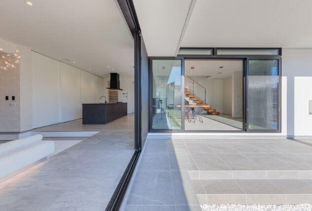 SE構法で大開口を実現した大きな窓と、地続きに繋がるタイルデッキで外もリビングの一部に。