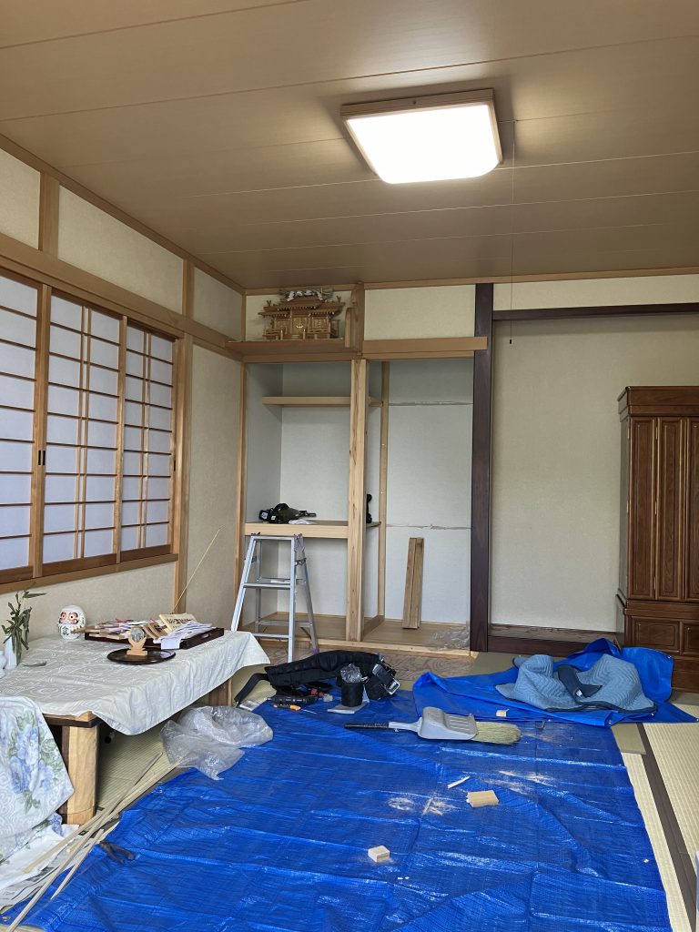 仏壇を先に購入してしまったが置き場所がない!ということで和室の収納スペースに仏壇の設置スペースと造作棚を施工させていただきました。
