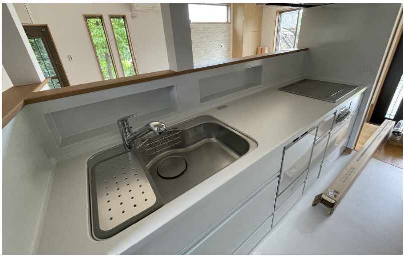 リフォーム後は明るい対面キッチンにし、収納力も抜群で手元を隠しつつオープンな空間になりました。 -