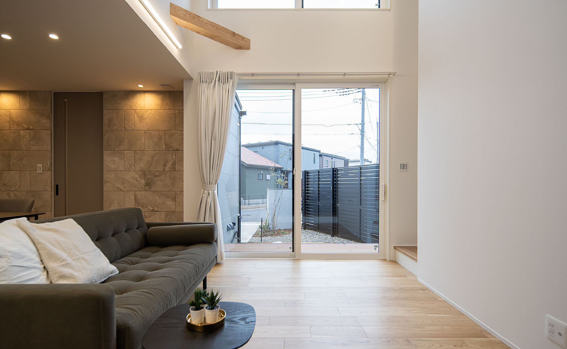 リビングは高窓からたっぷりと光が差し込む吹き抜けに。2階の子ども部屋へはリビング階段を経由する設計で、自然と家族のつながりが生まれます。庭につながるウッドデッキも嬉しいポイント。