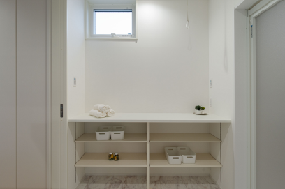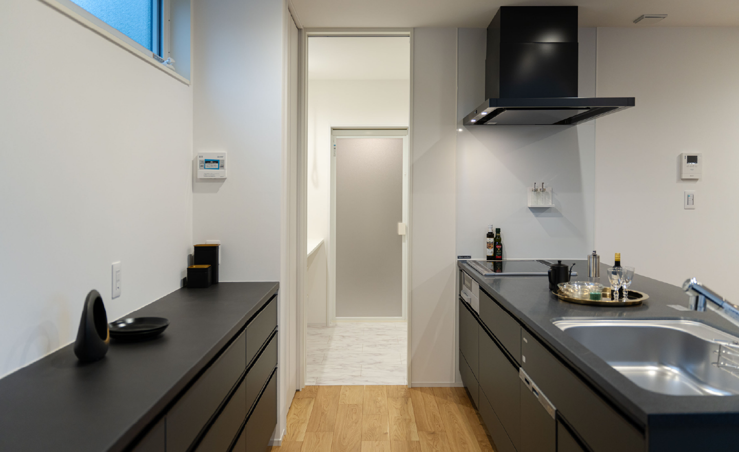 キッチン、ランドリールーム、浴室などの水回り一か所にまとまっているだけでなく、回遊できることで家事がしやすい動線です。