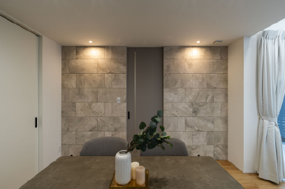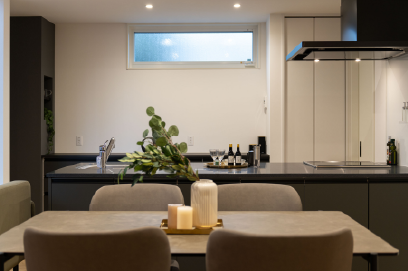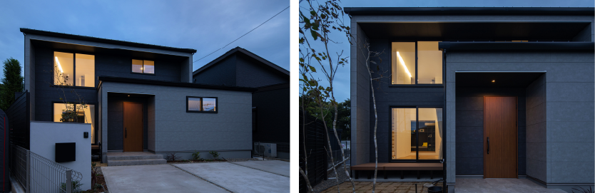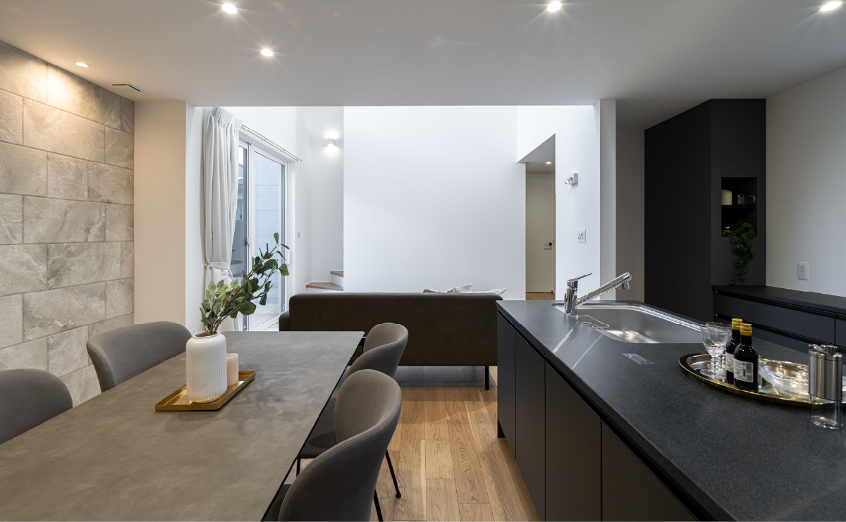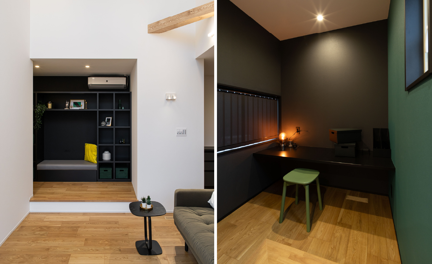 主寝室を1階に設け、家族のライフスタイルの変化によって平屋のようにも暮らせる、平屋+αの1.5階建て。部屋数は十分に確保しながらも、将来はミニマムに安心して暮らせる、平屋と2階建ての〝いいとこ取り”な住まいです。それだけでなく、吹き抜けの明るいリビングに隣接して設けられたライブラリーコーナーや書斎は、日々の暮らしにゆとりある時間を生み出します。※申請上は2階建てになります。