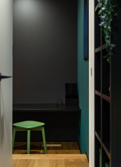 リビングに隣接するライブラリーコーナーは、段差を設けることで非日常的な空間に。その奥にはこもり感のある書斎も。お仕事だけでなく、趣味スペースとしても◎。