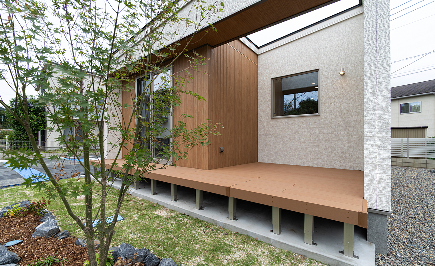 夏は子ども用プール、たまにはお庭でBBQなど、あると嬉しいウッドデッキ。 天井が吹き抜けになっているので、星空を見ながら癒し時間を過ごすのも◎。