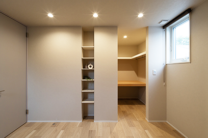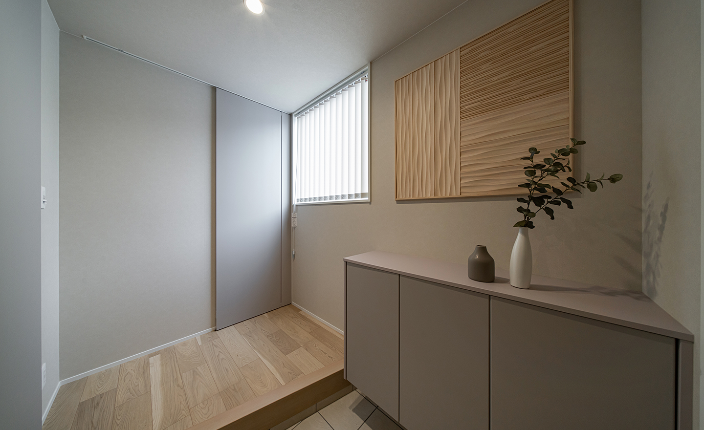 玄関からLDKへと繋がる動線と、クロークを通ってパントリーに繋がる動線がある2way玄関。 帰宅時や買い物帰りに便利な家族用動線と来客用動線を分けることで、いつでもすっきりな玄関に。
