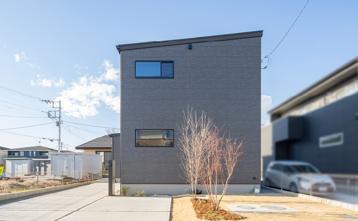 駐車スペースは敷地形状に合わせ建物形状を工夫することで、広々の3+1台分を確保。 来客時にも対応できる、ゆとりある駐車スペースです。 ※一部CG加工を施してあります。