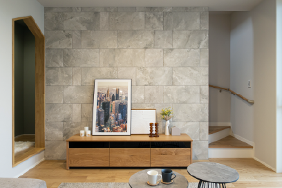 20.8帖の広々空間は、家族の集いの場。南側の大きな窓から光が降り注ぎ、ウッドデッキとの一体感を生みます。 ウッドフェンスで外からの視線も気にならず、カーテンを開放して過ごせます。 TV背面の石目調のエコカラットが、調湿・脱臭効果で快適さもプラスします。