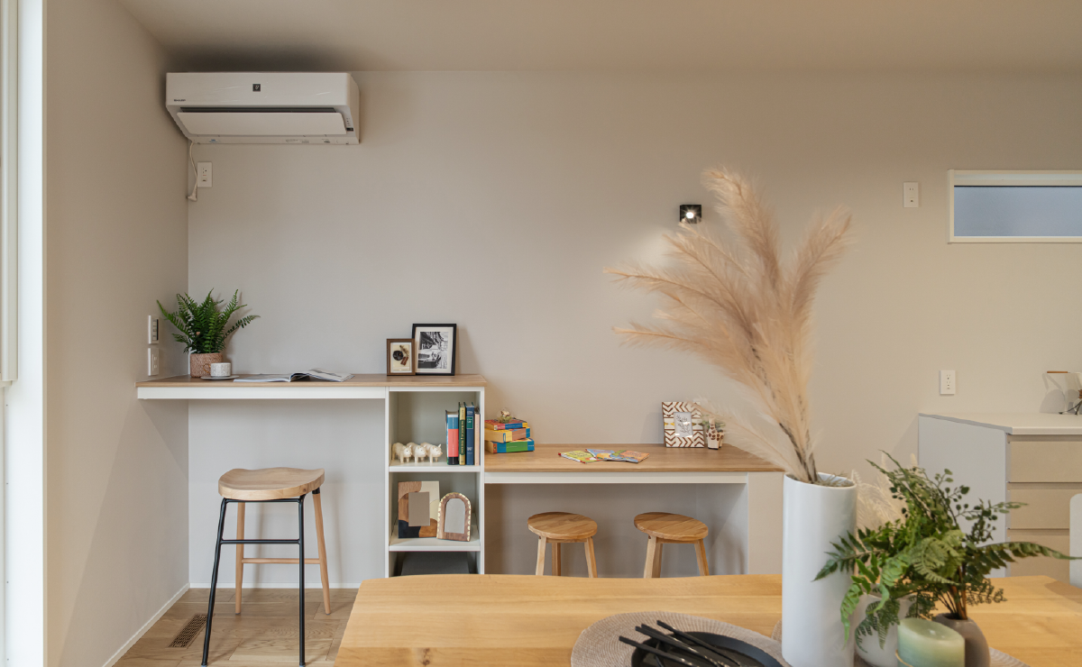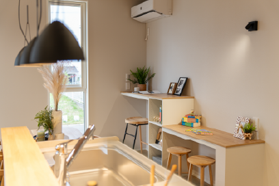 ハイ・ローの段違いカウンターが、大人と子どものスペースをゆるやかに分けます。 キッチン脇にあるため、お子様はすぐに質問でき、親御様は見守りながら家事も両立。 壁面を作品展示コーナーにすれば、お子様の自己肯定感を育む場所にもなります。