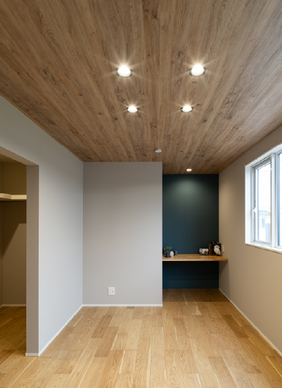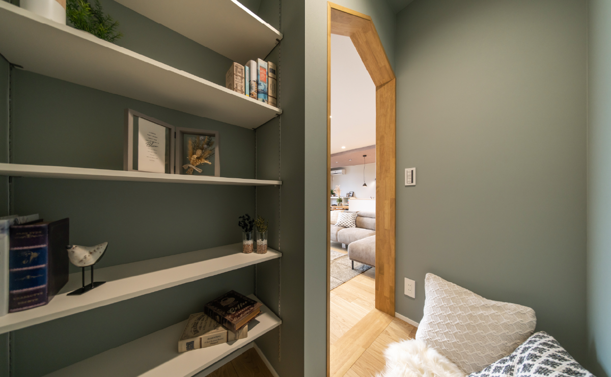 人気の三角下がり壁で個室感を演出。 リビングの気配を感じながらも、マットな単色でまとめた壁と天井が「異空間」のような自分だけの特別な場所に。 読書や趣味など、静かに落ち着きたいひとときに最適です。