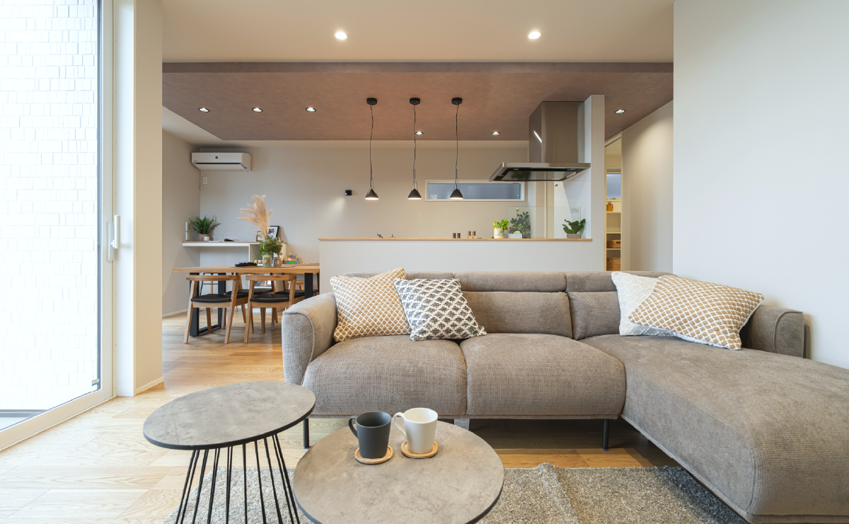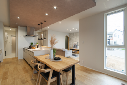 自然を意識した優しいカラーコーディネートと、大きな窓から光が差し込む開放的な空間は、家族の毎日を心地よく彩ります。