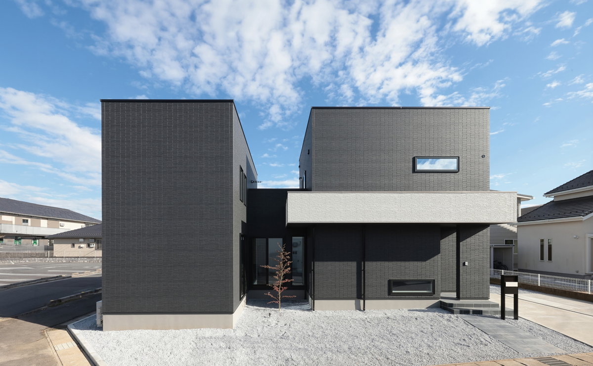 敷地条件を最大限に活かす「L字型の外観」に設計。自然素材を取り入れた住まいにするため、床には天然木(ハルニレ)、リビング天井には木パネル、TV背面にはエコカラットを採用しています。観葉植物などを置けるスペースとしてテラスも用意しました。