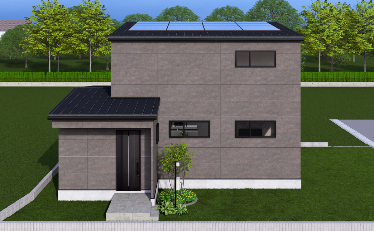 敷地条件を最大限に活かす「L字型の外観」に設計。自然素材を取り入れた住まいにするため、床には天然木(ハルニレ)、リビング天井には木パネル、TV背面にはエコカラットを採用しています。観葉植物などを置けるスペースとしてテラスも用意しました。