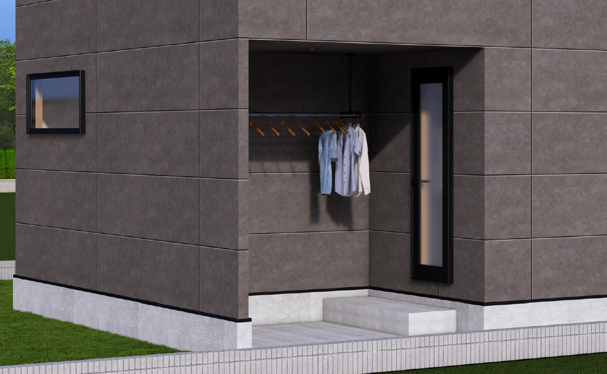 家事や遊び、趣味の時間も自由に楽しめる半屋外サービスヤード。 洗濯物干しや子どものプール遊び、アウトドア用品の収納など、使い方は無限大。 道路側から直接見えない設計で、気兼ねなく使える空間です。