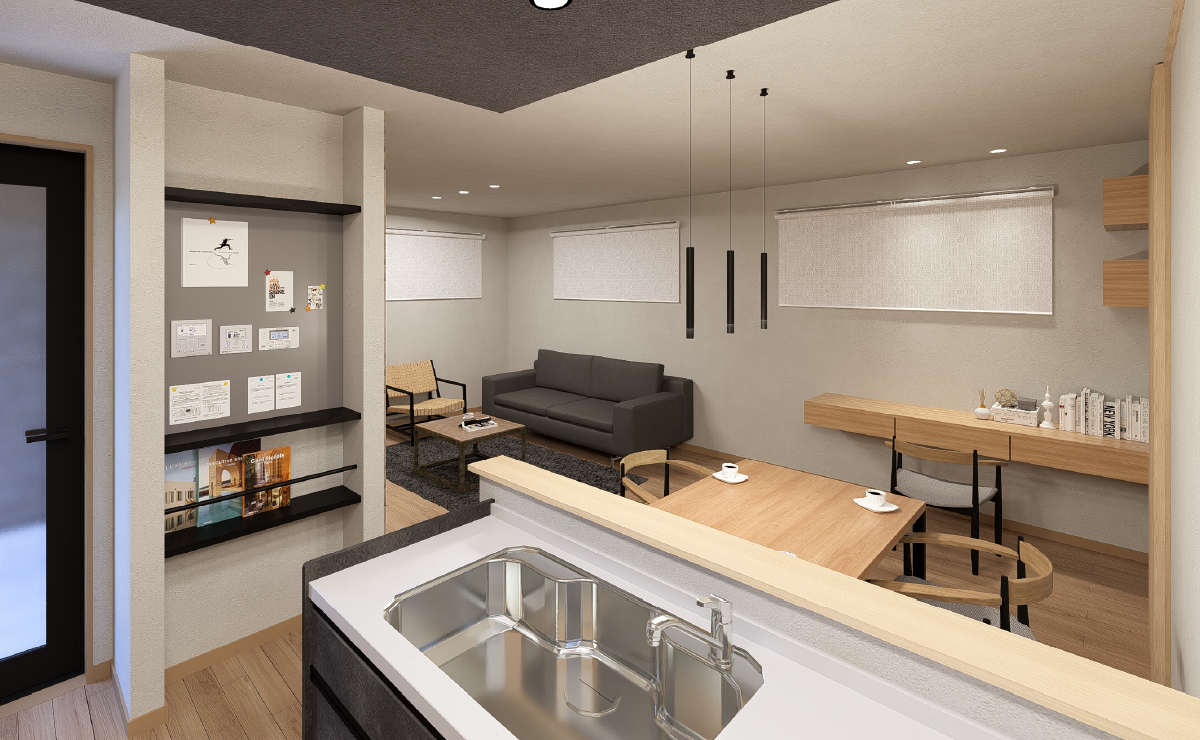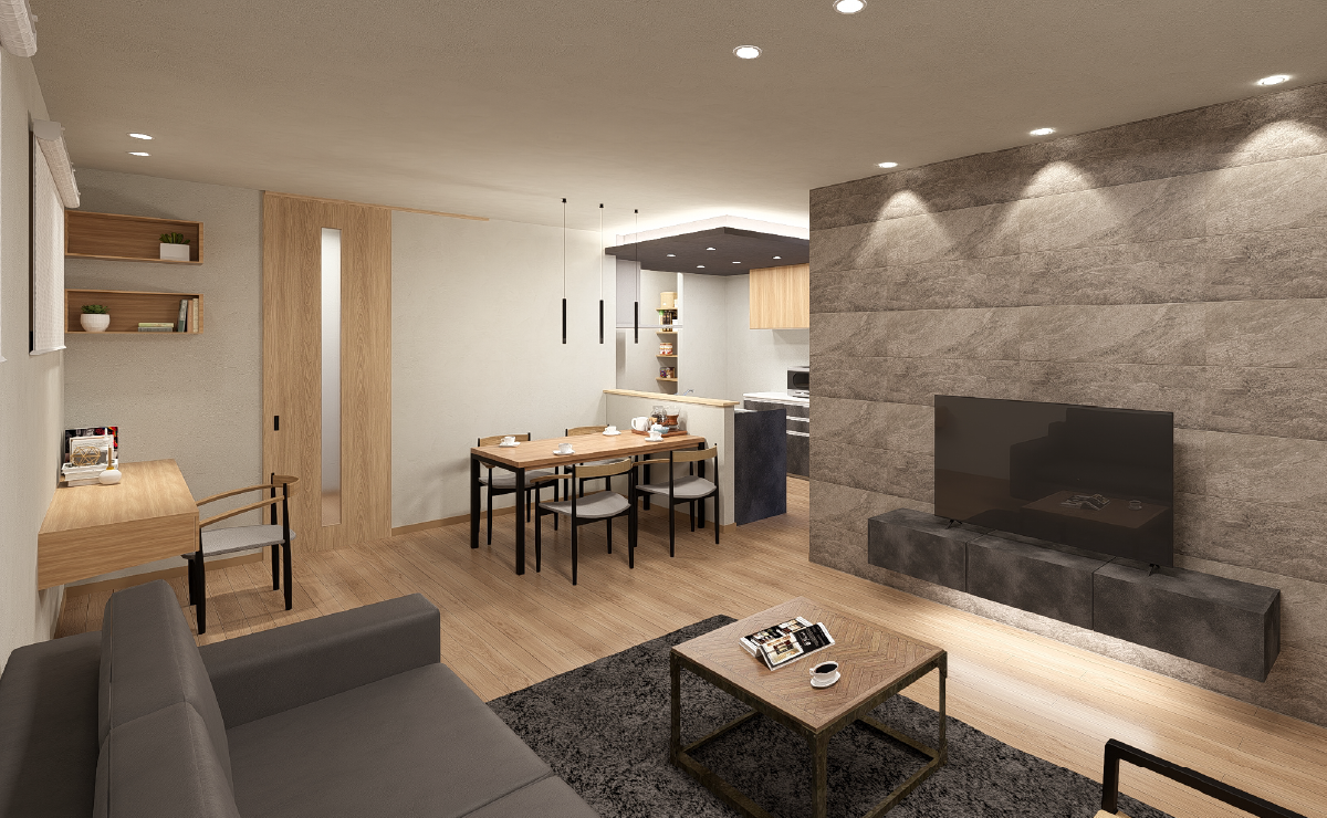 木目の温もりに、グレーとブラックのトーンを合わせ、落ち着きと品格を感じるホテルライクなインテリア。