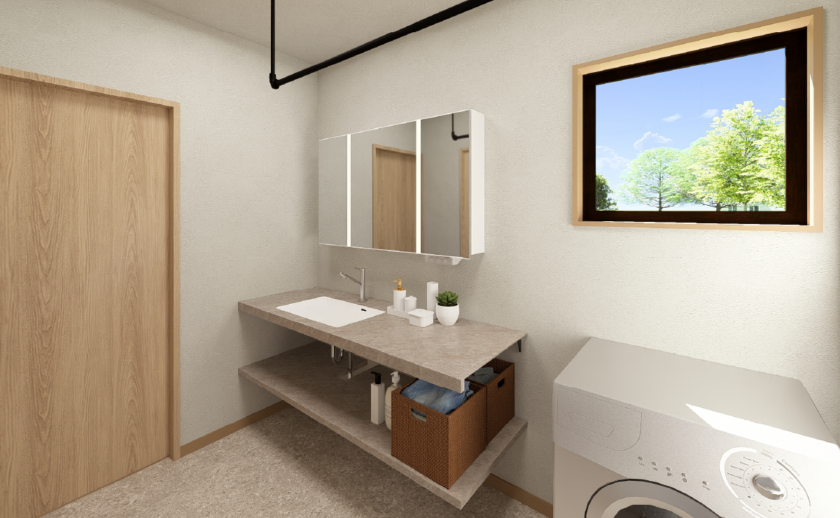 造作洗面台は幅165cmのゆったり設計で、二人並んでも快適に使えます。 収納は自由にアレンジでき、タオルや小物をすっきり整理可能。 毎日の身支度が心地よく整い、家族みんなが使いやすい快適な空間です。