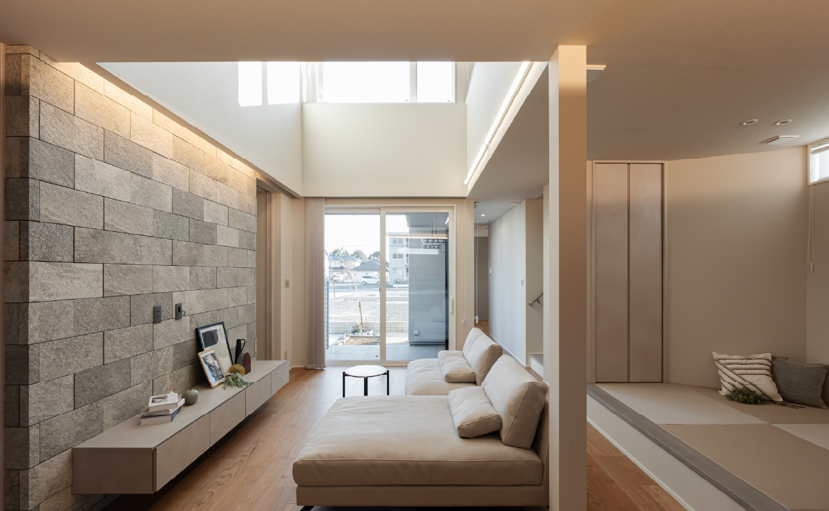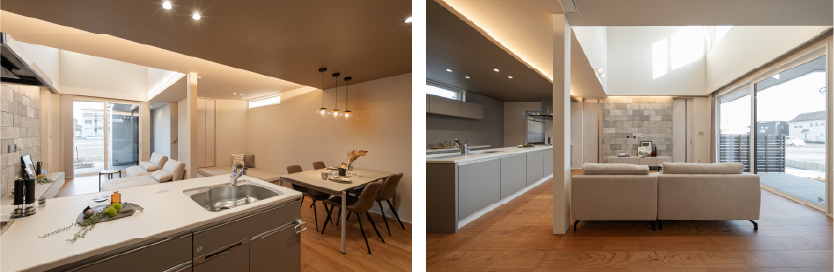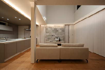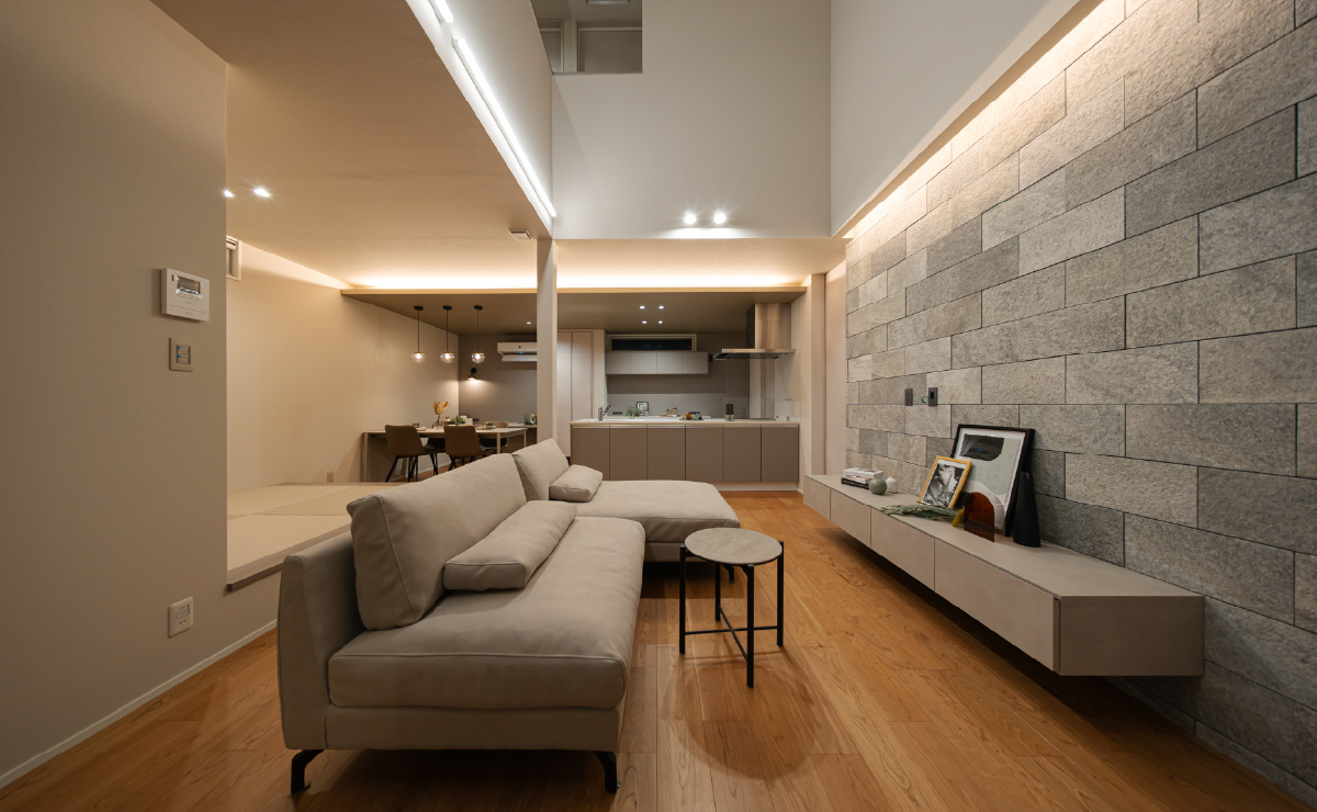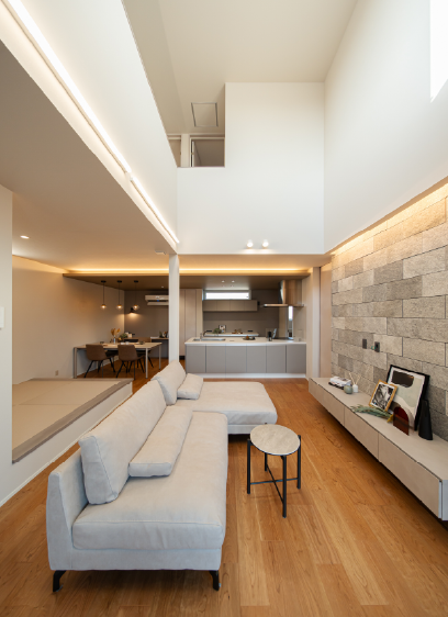 吹き抜けのあるLDKはハイサッシで光を採り入れ、広々とした開放空間に。 アクセントとなるタイル壁面や間接照明が空間をやさしく彩り、家族がゆったりくつろげる雰囲気を演出します。