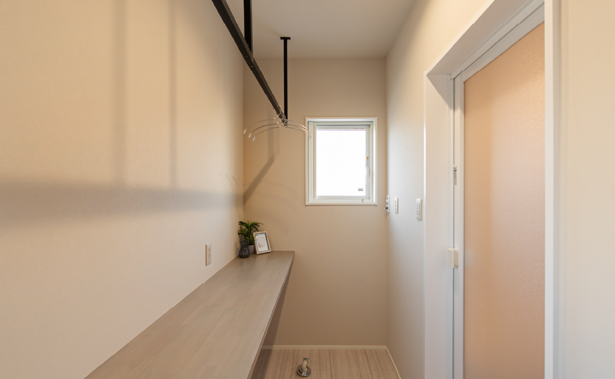 キッチン隣のランドリールーム。 家事動線がスムーズで、物干しから畳み、アイロンがけまで一ヶ所ででき、効率よく家事をこなせます。
