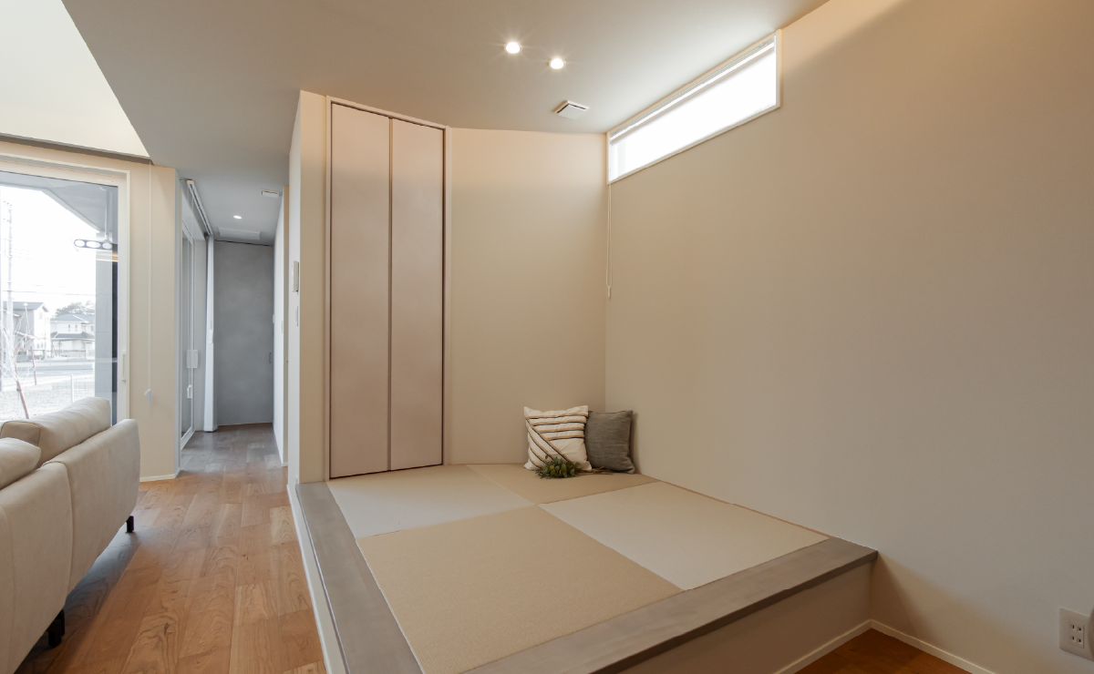 リビングに隣接した小上がりの畳コーナーは、くつろぎの空間や遊び場としても活躍。 階段下の収納も利用でき、家族で過ごす時間や読書、ちょっとしたお昼寝まで、多彩に使える心地よい空間です。