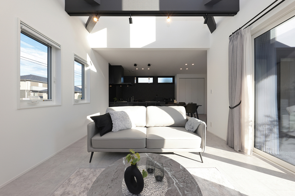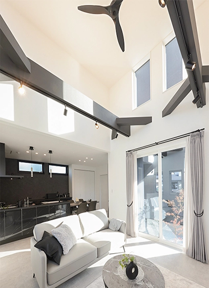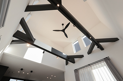 中庭と吹抜から陽光の差し込むリビング、見せ梁のダウンライトがアクセント。